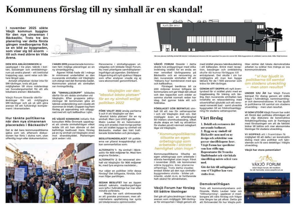 För att göra Växjöborna uppmärksamma på frågan har vi utformat en annons som snart kommer in i lokaltidningen. Annonsen är vår summering av hela processen från 2019 fram till dagsläget i kommunfullmäktige.